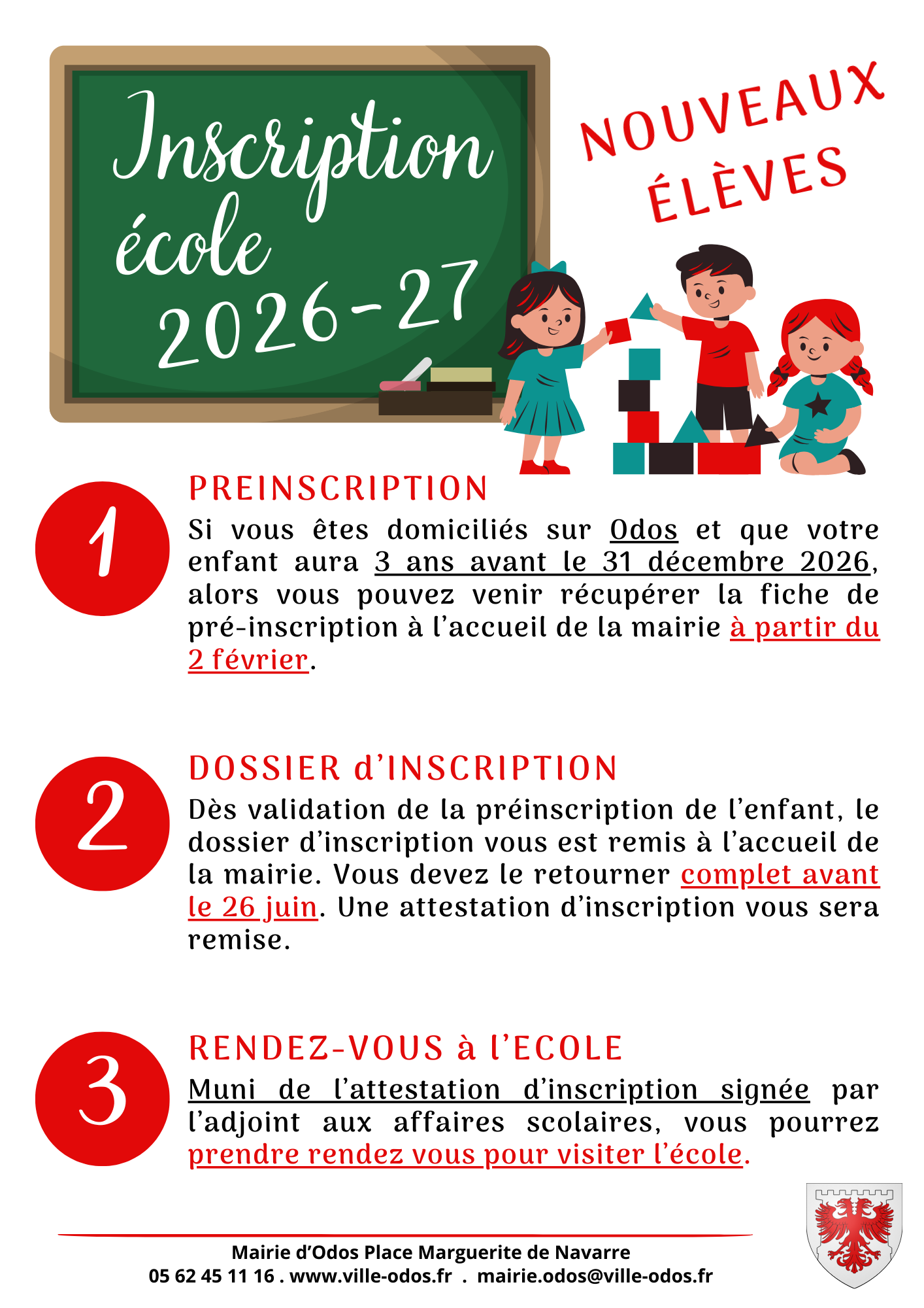 Si vous résidez à Odos et que votre enfant aura plus de 3 ans le 31/12/26, vous pouvez venir retirer un dossier à l'accueil de la mairie!
