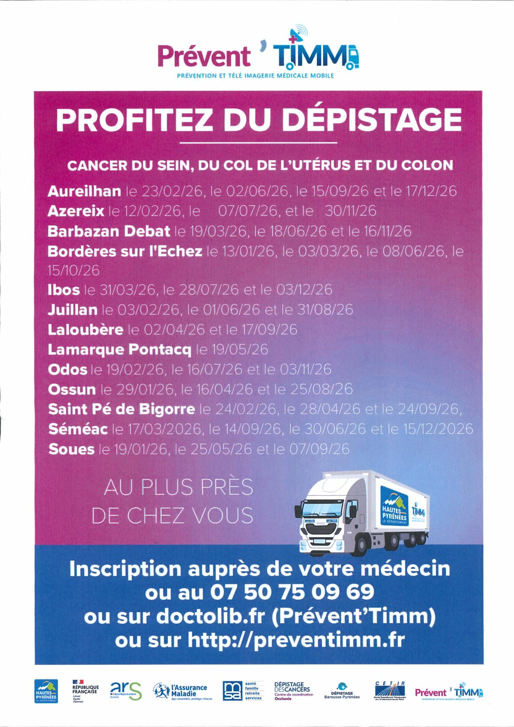 Le camion Prévent’TIMM est un dispositif dédié à la prévention santé et au dépistage organisé des cancers du sein, du col de l’utérus et du côlon. Il est piloté par le Département des Hautes-Pyrénées et l’ARS 65, en partenariat avec la CPAM, la MSA, la SELAS Dépistage Barousse Pyrénées, le CETIR ainsi que les professionnels de santé du territoire (médecins généralistes, sages-femmes…).